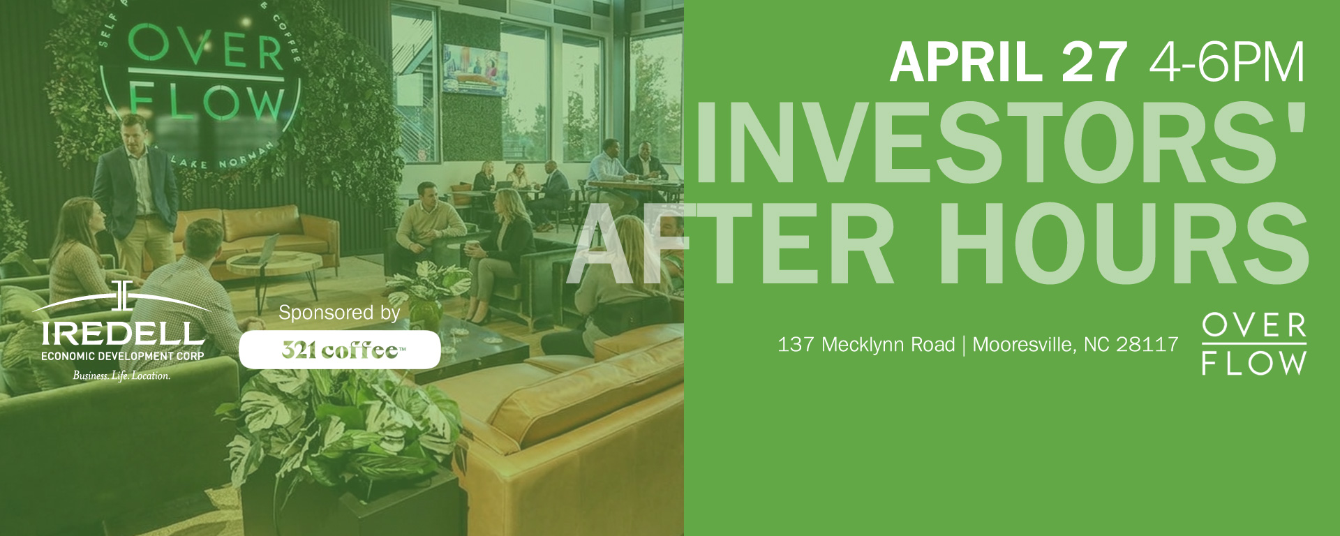 Our investor network includes more than 100 representatives of a broad cross-section of businesses and industries, all committed to the growth and prosperity of Iredell County. We would like to invite you to join us and this exclusive group for an Investors’ After Hours event, sponsored by 321 Coffee.