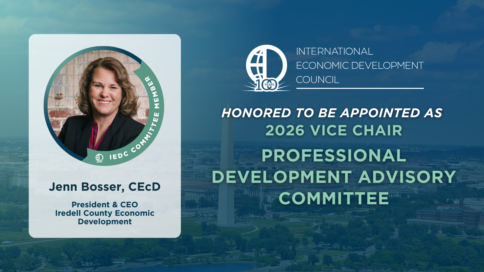The International Economic Development Council (IEDC) has appointed Jennifer Bosser, CEcD, President & CEO of the Iredell County Economic Development Corporation, to a one-year term as Vice Chair of its Professional Development Advisory Committee.