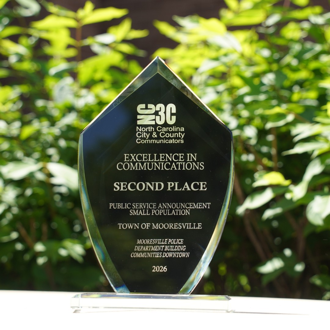 The North Carolina City & County Communicators (NC3C) recognized the Town of Mooresville with an Excellence in Communications award for their Public Service Announcement Video (Small Population) for “Mooresville Police Department Building Communities Downtown.”